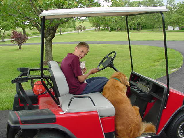 Me and my dog Maggie, my cat Vern riding the golf cart on the driveway of our house.